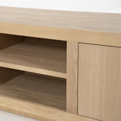Achter de twee deuren vind je voldoende opbergruimte voor bijvoorbeeld kabels, media-accessoires of spelconsoles. In het open middenvak met legplank plaats je eenvoudig je decoder of soundbar.